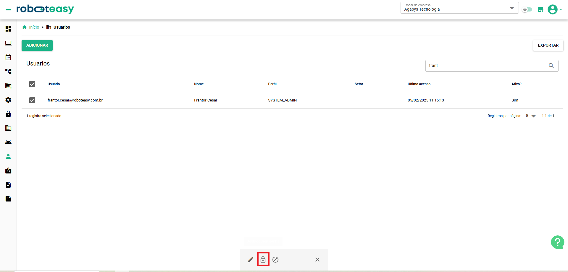 * Visualização de usuário com senha bloqueada para administrador do sistema