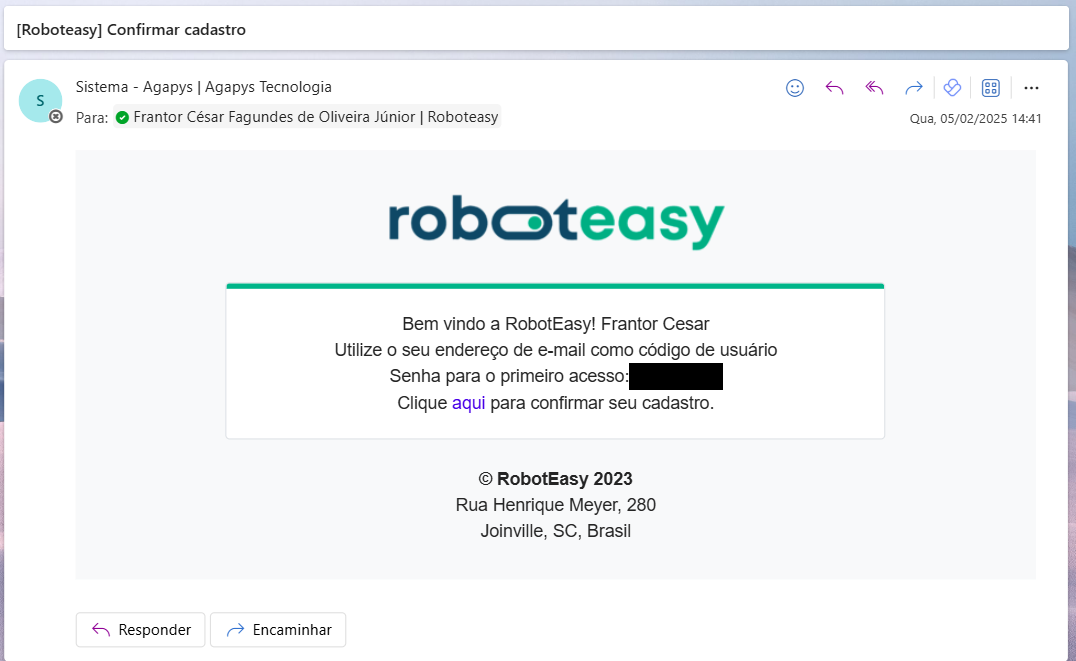 A nova senha deve estar de acordo com nossa [Política de senha segura](https://docs.roboteasy.tech/orquestrador/geral/politica-de-senha-segura)