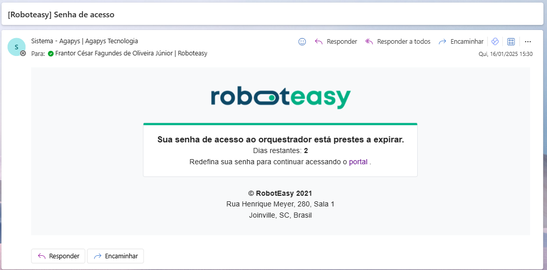 A nova senha deve estar de acordo com nossa [Política de senha segura](https://docs.roboteasy.tech/orquestrador/geral/politica-de-senha-segura)