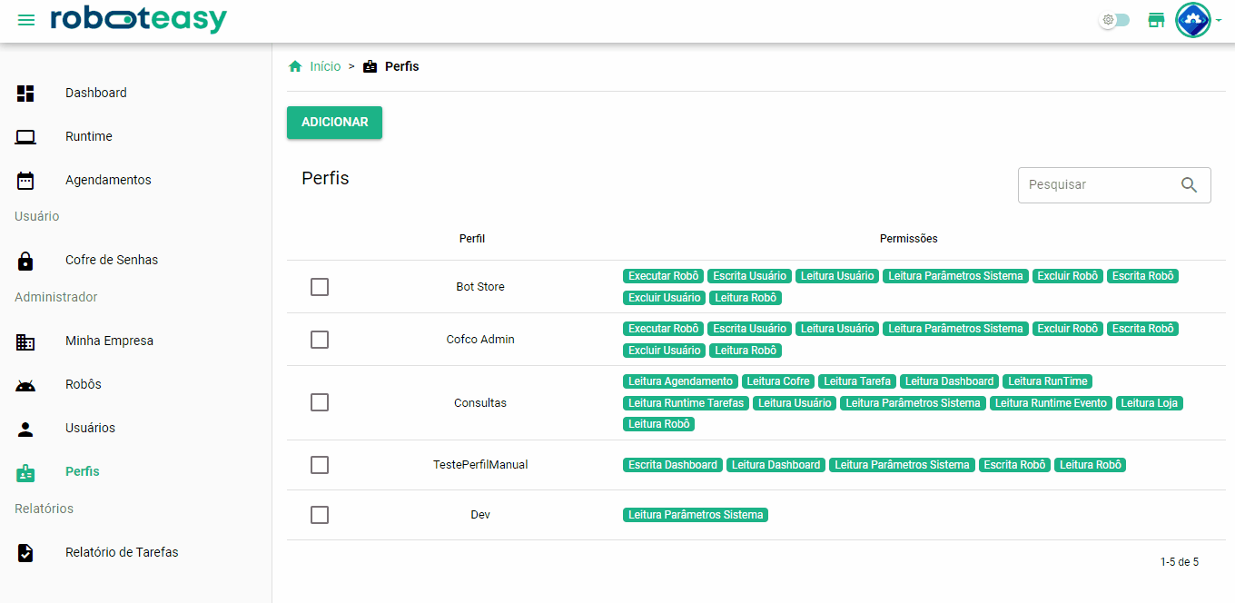 No menu perfis de usuário, o administrador poderá gerenciar diferentes acessos para atribuir aos seus usuários.