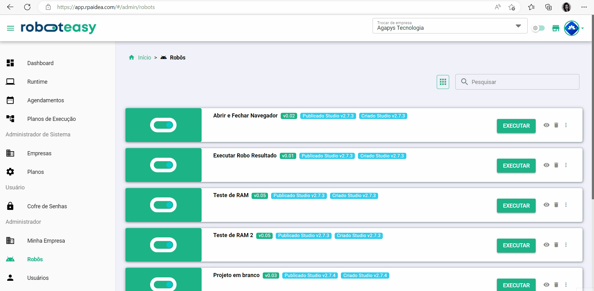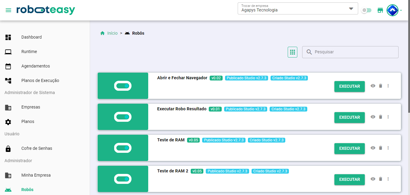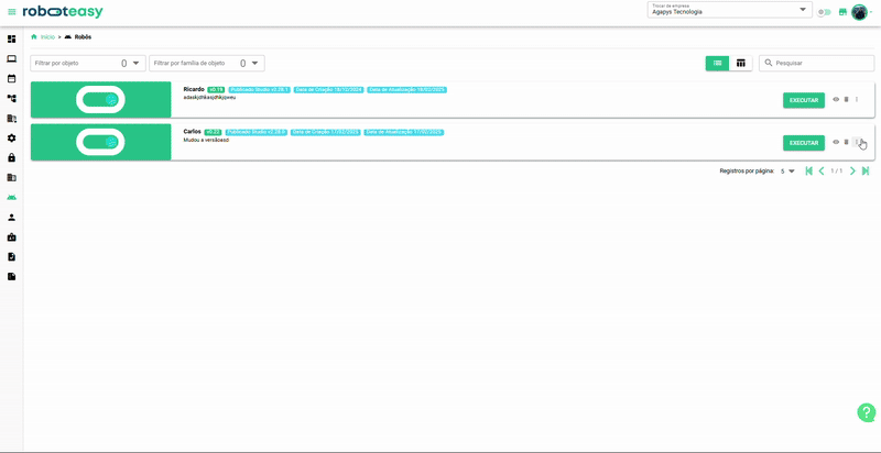 Nesta página, são exibidos os robôs publicados. É possível visualizar, remover, executar, fazer o download, verificar as versões publicadas e capturar dados para execução via API.