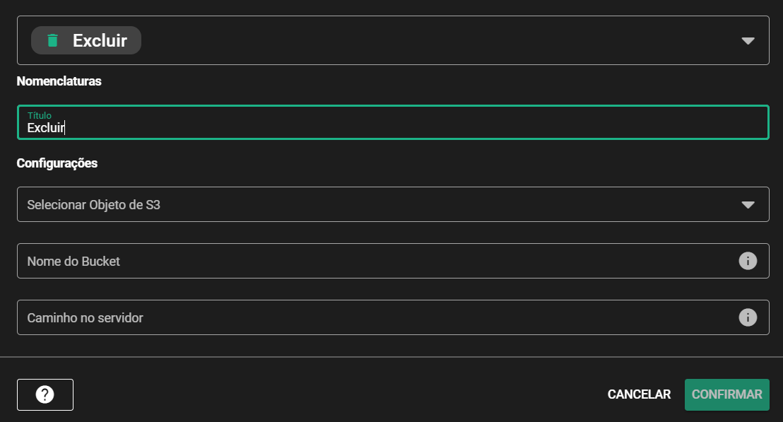 <table><thead><tr><th width="374">Campo</th><th>Descritivo</th></tr></thead><tbody><tr><td>Título</td><td>Título do objeto.</td></tr><tr><td>Selecionar Objeto de S3</td><td>Variável de Instancia conectada ao S3.</td></tr><tr><td>Nome do Bucket</td><td>Nome de acesso ao bucket.</td></tr><tr><td>Caminho do Servidor</td><td>Caminho do Arquivo ou Pasta para excluir.</td></tr></tbody></table>