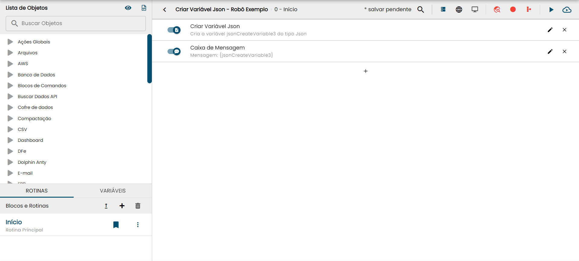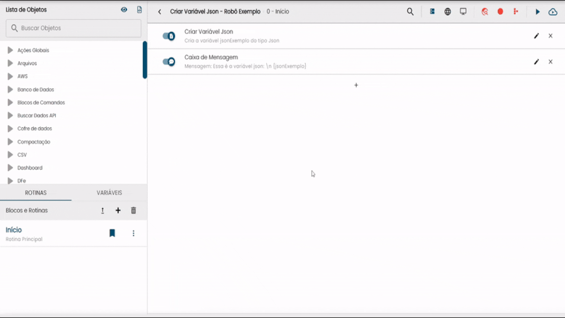 <figure><img src="https://1906991432-files.gitbook.io/~/files/v0/b/gitbook-x-prod.appspot.com/o/spaces%2FABFcMeFxBJhKzVOwJbRE%2Fuploads%2FtEjpEJzteimo6o8Iqcx4%2FcriarVariavalFinal-ezgif.com-optimize.gif?alt=media&#x26;token=0db40a6c-b5da-4672-bc63-3e187d9c6bf6" alt=""><figcaption><p>Execução Sucesso Robô Exemplo Criar Variável Json</p></figcaption></figure>