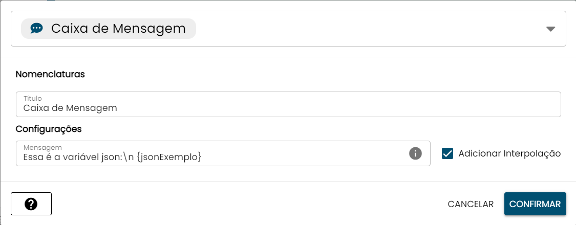 <figure><img src="https://1906991432-files.gitbook.io/~/files/v0/b/gitbook-x-prod.appspot.com/o/spaces%2FABFcMeFxBJhKzVOwJbRE%2Fuploads%2FBWgdM2ID8a5gNXJikS2g%2Fimage.png?alt=media&#x26;token=c2ee1c9d-2763-4ee2-b04b-24d416615f66" alt=""><figcaption><p>Configuração Caixa de Mensagem</p></figcaption></figure>