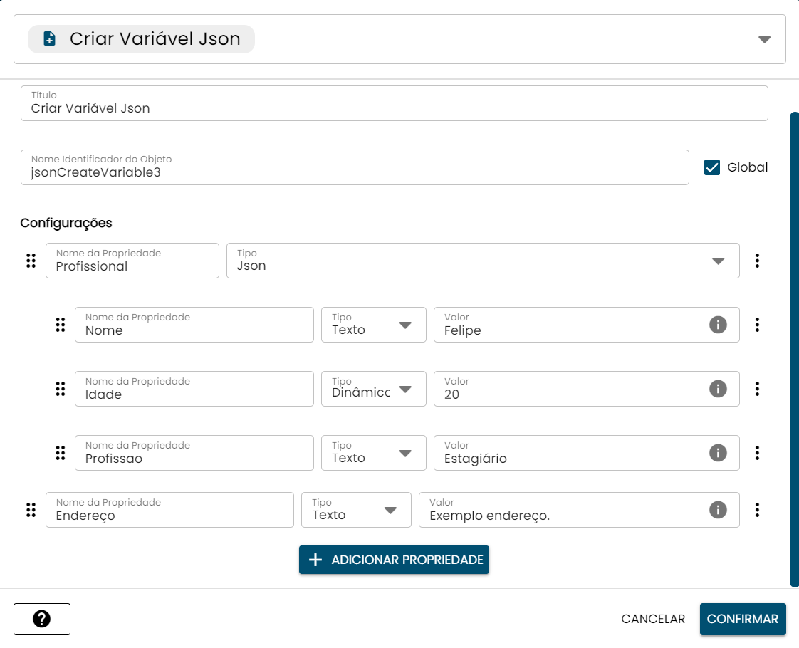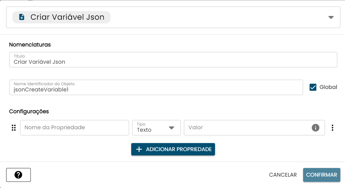 <figure><img src="https://1906991432-files.gitbook.io/~/files/v0/b/gitbook-x-prod.appspot.com/o/spaces%2FABFcMeFxBJhKzVOwJbRE%2Fuploads%2FnwMdcNxJf3GCp3Ck4Eyb%2Fimage.png?alt=media&#x26;token=9b3745e6-7a40-49fa-b4af-7f5aa0e5faca" alt=""><figcaption><p>Configuração Criar Variável Json</p></figcaption></figure>