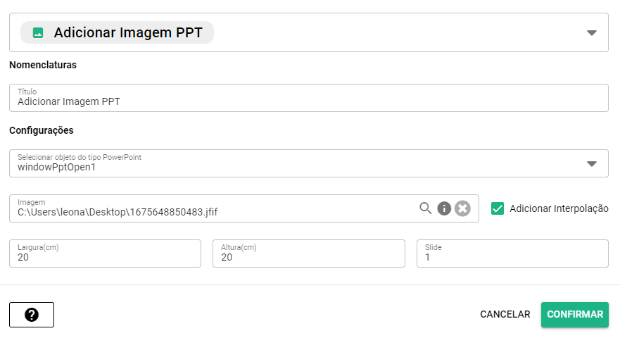 <figure><img src="https://1906991432-files.gitbook.io/~/files/v0/b/gitbook-x-prod.appspot.com/o/spaces%2FABFcMeFxBJhKzVOwJbRE%2Fuploads%2F3Q13bLi4SfdqMsgFL6i4%2Fadicionar%20imagem%20PPT.PNG?alt=media&#x26;token=01cf8428-7469-4b7e-9b45-1a66d8c93201" alt=""><figcaption><p>Configuração Adicionar Imagem PPT</p></figcaption></figure>