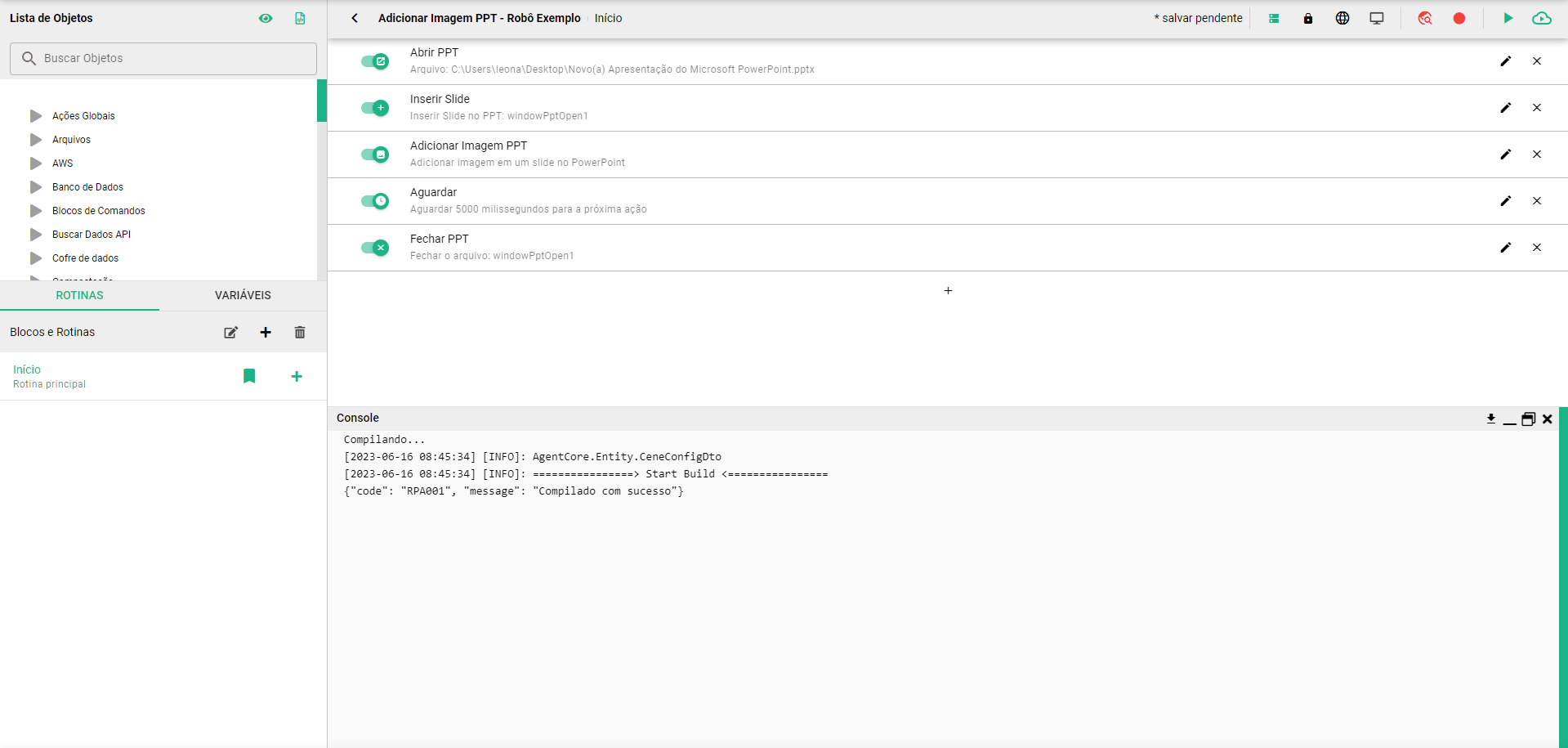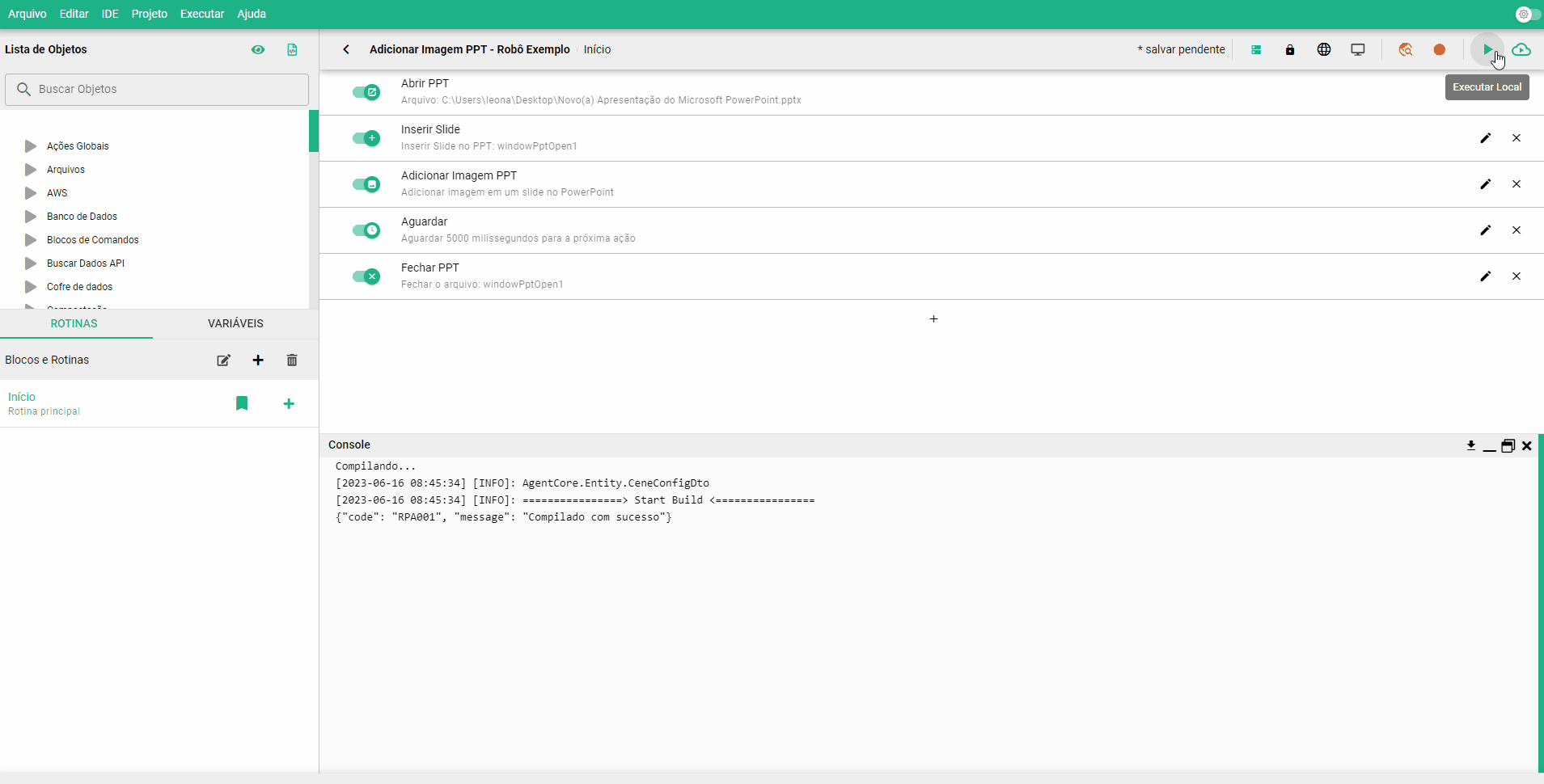 <figure><img src="https://1906991432-files.gitbook.io/~/files/v0/b/gitbook-x-prod.appspot.com/o/spaces%2FABFcMeFxBJhKzVOwJbRE%2Fuploads%2FlWrE1wLcO6MymDiyXfv1%2FExecu%C3%A7%C3%A3o%20Sucesso%20Rob%C3%B4%20Exemplo.gif?alt=media&#x26;token=4cb16a3d-a115-49f8-ad1d-b1fd8df79f37" alt=""><figcaption><p>Execução Sucesso Robô Exemplo Adicionar Imagem PPT</p></figcaption></figure>