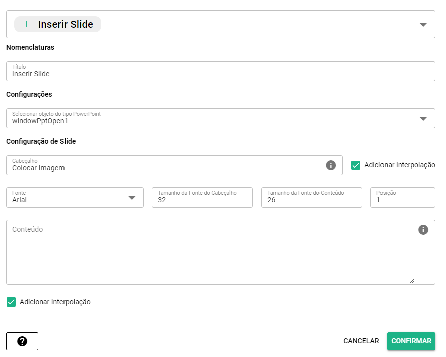 <figure><img src="https://1906991432-files.gitbook.io/~/files/v0/b/gitbook-x-prod.appspot.com/o/spaces%2FABFcMeFxBJhKzVOwJbRE%2Fuploads%2FU7kU4ItPFS4cnsLMBp08%2Finserir%20slide.PNG?alt=media&#x26;token=f7d22492-5f25-43c2-8be1-d67736c038b8" alt=""><figcaption><p>Configuração Inserir Slide</p></figcaption></figure>