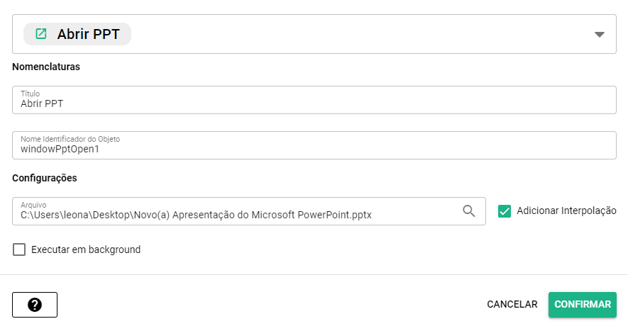 <figure><img src="https://1906991432-files.gitbook.io/~/files/v0/b/gitbook-x-prod.appspot.com/o/spaces%2FABFcMeFxBJhKzVOwJbRE%2Fuploads%2FqEEsWNkcvctrsHydDWov%2Fabrir%20ppt.PNG?alt=media&#x26;token=8d443165-0f0c-4d0f-a4c1-0b0555ac6743" alt=""><figcaption><p>Configuração Abrir PPT</p></figcaption></figure>